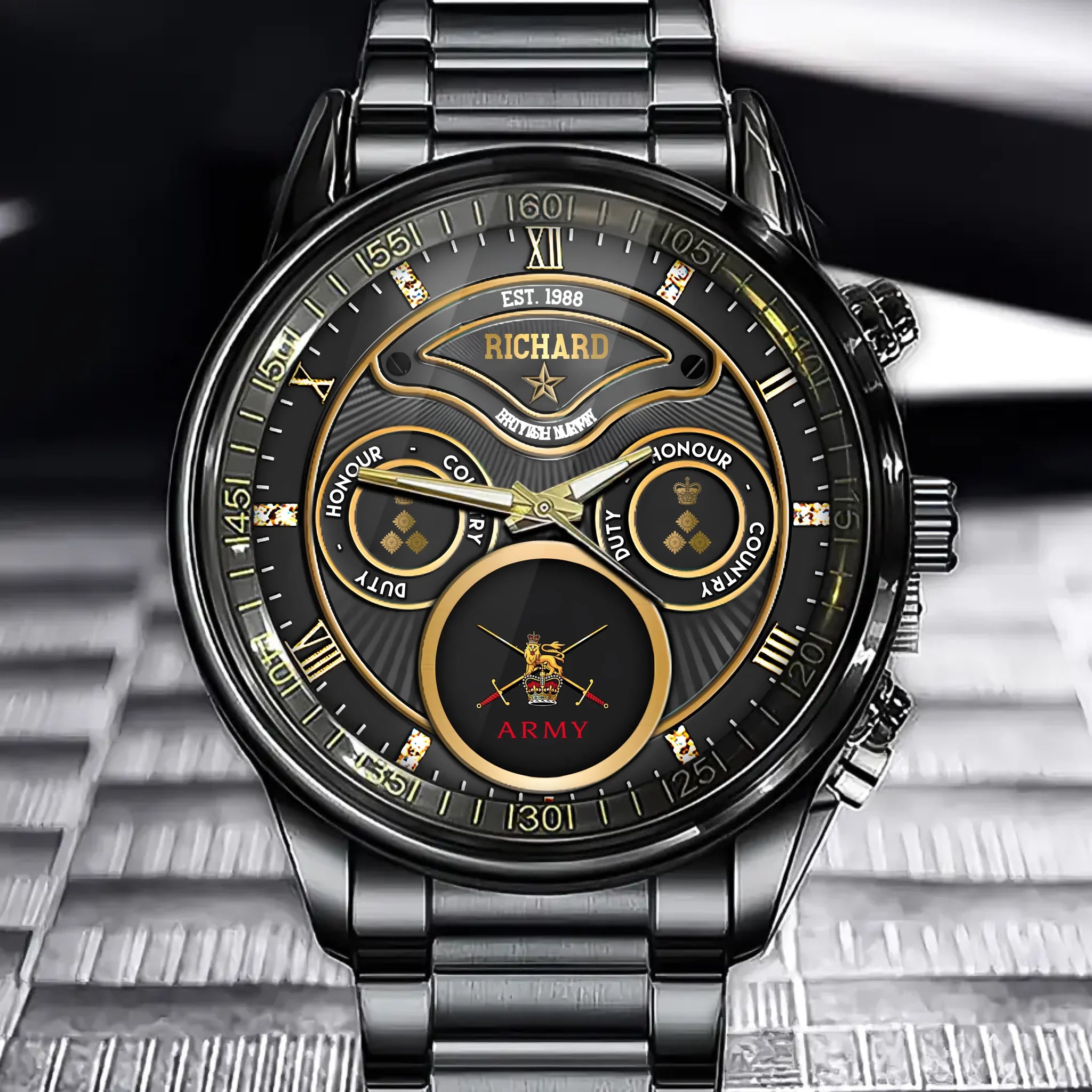 Customized British Veteran Military Insignia & Rank Gold Watch with Personalized Name & Service Dates