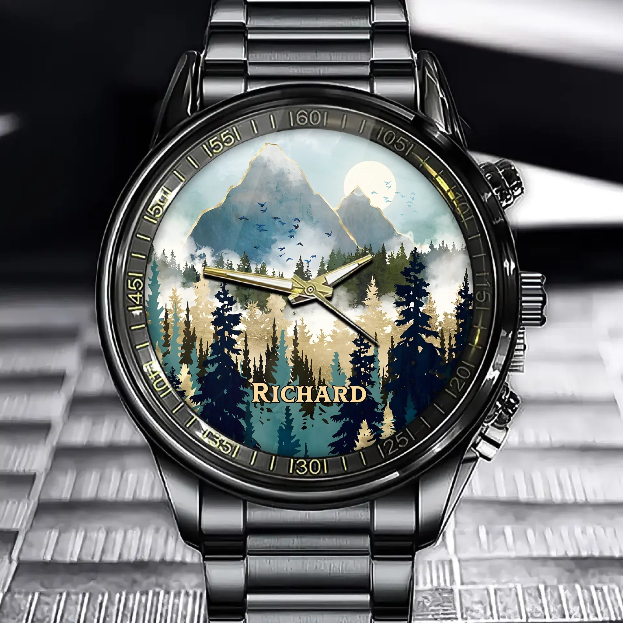 Golden Forest Serenity Watch – Personalized Name on Artistic Scenic Dial